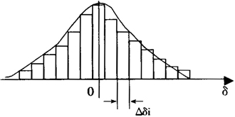 大大小小地合理賦予被測量Y之值yi,在其分散區(qū)間內(nèi)等間隔地分成若干(例如15個(gè))小的區(qū)間,則yi分別落在這些小區(qū)間中的數(shù)目多少,表明了落在這個(gè)區(qū)間的概率大小,這樣,如以縱坐標(biāo)表示概率,則形成了一個(gè)概率分布曲線。下圖就是一個(gè)近似正態(tài)的分布曲線,Δδi為每個(gè)小間隔。