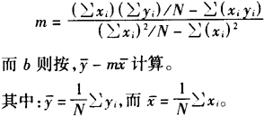 直線擬合為最常用也最簡單的一種,它給出兩個變量x、y間的線性關(guān)系。通過測量出一組數(shù)據(jù)(xi,yi),i=1,2,…,N,得到的一條直線y=mx+b應該是所有這些點(xi,yi)與這條直線垂直距離之差的平方和為最小,所謂最小二乘即此意。式中m是直線斜率(也稱回歸系數(shù)),b是直線在y軸上的截距,m由下式可算出: