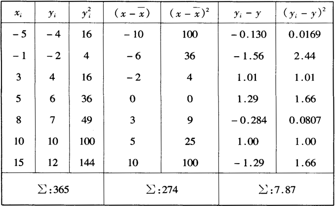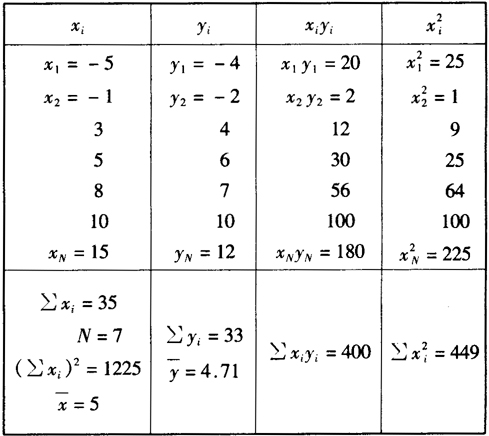 例如:求測出的點(-5,-4),(-1,-2),(3,4),(5,6),(8,7),(10,10),(15,12)這7個點,N=7的計算列表如下: