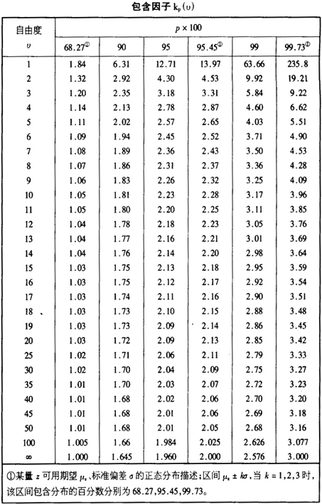 當有了自由度υ以后,可以按以下t值在表格中查出kp=tp(υ)這個值。例如:已知的自由度υ=10,采用的置信概率p=0.99,表中給出kp=3.17,這個值比上述6.5中的2.58大了不少,約五分之一。這樣,通過Up/kp所得的標準不確定度就會比用k=2.58除得出的值要小約五分之一。油水不少!