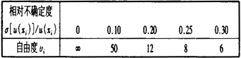 例如:考慮到輸入估計值xi及其標準不確定度u(xi)的信息,判斷u(xi)的值大約不可靠到25%,就意味其相對不確定度△u(xi)/u(xi)=25%,代入上式,得υi=(0.25)-2/2=8。如果判斷u(xi)之值大約只有50%可靠,也就是50%不可靠。代入上式,算出υi=2,實際工作中,一般只估計出其不可靠的百分數(shù),查下表即可: