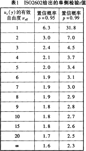 不論是單側(cè)還是雙側(cè)檢驗,其定量指標的測量結(jié)果不確定度評定中的各輸入量Xi的不確定度u(xi)以及它們導(dǎo)致的輸出量Y的不確定度分量u(y,xi)和Y的估計值y的合成標準不確定度uc(y)都是相同的。單側(cè)與雙側(cè)所不同的只是從uc(y)計算成U(y)或UP(y)所需要的包含因子k不同。ISO2602給出的用于單側(cè)檢驗的t值(相當于JJF1059中附錄A)如下: