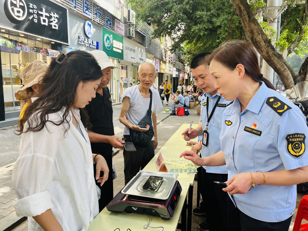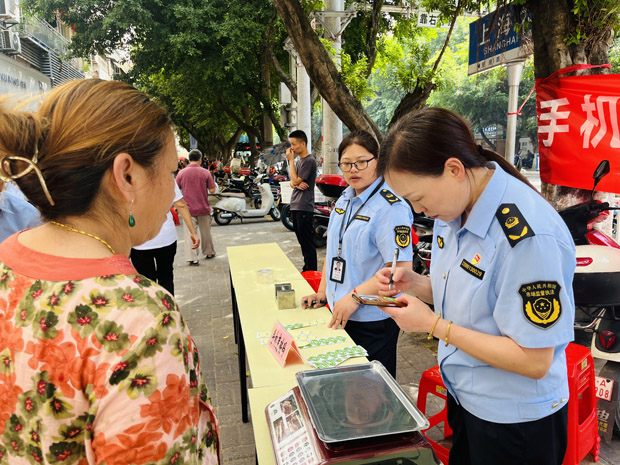 二是“定點(diǎn)式+流動(dòng)性”惠民生。在全區(qū)常設(shè)14個(gè)活動(dòng)便民服務(wù)點(diǎn),由專(zhuān)人負(fù)責(zé)提供手機(jī)稱(chēng)重體驗(yàn)服務(wù),指導(dǎo)廣大群眾學(xué)會(huì)用手機(jī)秒變隨身便攜的“小砝碼”,快速辨識(shí)不法商家的“鬼秤”。深入農(nóng)貿(mào)市場(chǎng)、大型商超、市民中心等人流密集區(qū)域,采用群眾喜聞樂(lè)見(jiàn)的方式開(kāi)展體驗(yàn)活動(dòng),工作人員現(xiàn)場(chǎng)演示“作弊秤”運(yùn)行模式、講解如何讓手機(jī)變“砝碼”等計(jì)量知識(shí),開(kāi)展體驗(yàn)服務(wù)活動(dòng)5場(chǎng)次,發(fā)放宣傳資料500余份,接受群眾咨詢(xún)300余人次。同時(shí),向廣大消費(fèi)者現(xiàn)場(chǎng)征集“鬼秤”(作弊秤)線索,引導(dǎo)消費(fèi)者積極監(jiān)督舉報(bào)經(jīng)營(yíng)者不法行為,讓誠(chéng)信經(jīng)營(yíng)、守法經(jīng)營(yíng)理念深入人心。