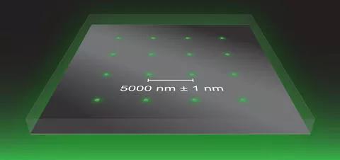 上圖顯示了一個(gè)間距為5000 nm±1nm的孔徑陣列??资构獯┻^載玻片上的金屬膜。利用光學(xué)顯微鏡對(duì)孔徑陣列成像會(huì)導(dǎo)致孔徑間距出現(xiàn)明顯誤差。了解真實(shí)間距可以校正這些成像誤差。這個(gè)校準(zhǔn)過程可以準(zhǔn)確測(cè)量大圖像上的位置。Credit: NIST