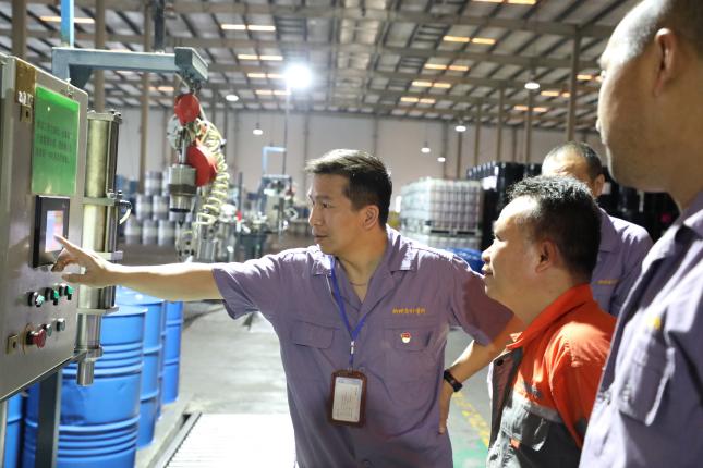 柳州市計(jì)量所“計(jì)量先鋒隊(duì)”現(xiàn)場(chǎng)指導(dǎo)企業(yè)對(duì)液態(tài)灌裝系統(tǒng)進(jìn)行調(diào)試