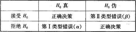上面的4種情況,很顯然,(2)與(3)是錯(cuò)誤的決定。當(dāng)然,人們都愿意做出正確的決定,但事實(shí)上難以做到。因此,必須考慮錯(cuò)誤的性質(zhì)和犯錯(cuò)誤的概率。我們把零假設(shè)為真時(shí)拒絕它,稱為第Ⅰ類錯(cuò)誤(或拒絕錯(cuò)誤);把零假設(shè)為假時(shí)接受它,稱為第Ⅱ類錯(cuò)誤(或接受錯(cuò)誤)。