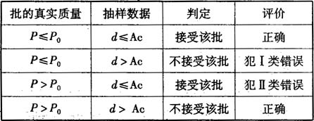 所以,只要采用抽樣檢驗(yàn),就有4種可能的判定(如表1所示),其中必定要產(chǎn)生兩種錯(cuò)誤的判定。即可能將接受批判定為不接受批,或者將不接受批判定為接受批。