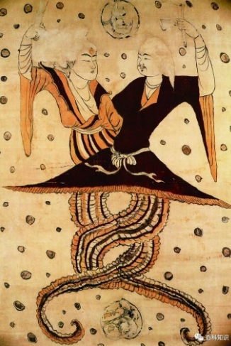 新疆吐魯番出土的唐代遺物伏羲女?huà)z圖,伏羲左手舉著矩,女?huà)z右手舉著規(guī)