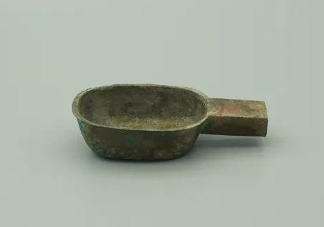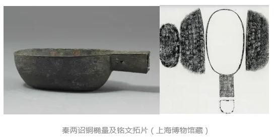 中國計(jì)量大學(xué)計(jì)量博物館館藏一件漢刻銘銅量(被吳鎮(zhèn)烽收錄于《商周青銅器銘文暨圖像集成三編》(第四卷),上海:上海古籍出版社,2020年,第334頁),國家三級文物。口呈橢圓形,直口,口沿外撇,腹壁向下漸收,平底,一側(cè)有短柄,柄上平面,且與器口平齊,下部作弧形,柄下部銘文:“今一斤四兩”,內(nèi)底部有“□”符號,柄內(nèi)有朽木痕跡,今實(shí)測重299.64克,通長16cm,口長11.1厘米,口寬7.9cm,高4.3cm,容194毫升,約合漢一升。該件銅量,為我們研究漢代量器及考訂量值提供了新的實(shí)物資料,還在一定程度上反映了漢代的政治、經(jīng)濟(jì)等方面情況。