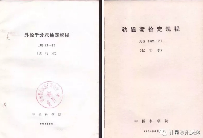 1958年以后一段時(shí)間,國(guó)家計(jì)量局一直由國(guó)家科委領(lǐng)導(dǎo),文化大革命期間國(guó)家科委和中國(guó)科學(xué)院合并成立了新的中國(guó)科學(xué)院,國(guó)家計(jì)量局和中國(guó)計(jì)量科學(xué)研究院都?xì)w為中國(guó)科學(xué)院領(lǐng)導(dǎo)。中國(guó)科學(xué)院于1970年4月至10月,邀請(qǐng)北京地區(qū)工礦企業(yè)等有關(guān)部門組成檢定規(guī)程修訂小組,選擇了使用比較普遍的千分尺等七種檢定規(guī)程進(jìn)行修訂,并以中國(guó)科學(xué)院的名義頒布實(shí)施。到目前為止,發(fā)現(xiàn)的最早采用“JJG”編號(hào)方法的檢定規(guī)程,是外徑千分尺檢定規(guī)程編號(hào)為:JJG21-71,外包皮為白色,尺寸為(20.9×14.8)cm。