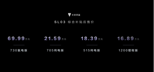 作為新品牌的開篇之作,長安深藍SL03搭載多項全球首發(fā)及行業(yè)率先量產(chǎn)的技術(shù),實現(xiàn)了在智能、續(xù)航、三電領(lǐng)域的三大超級突破。在本次上市發(fā)布會上,共推出純電版、增程版、氫電版三種能源形式、4款配置版本的車型,并將提供包含啞光車漆、多種內(nèi)飾CMF、運動輪轂、高階智能駕駛輔助服務等個性化選裝來滿足用戶的多樣化需求,新車的官方指導價16.89-69.99萬元。