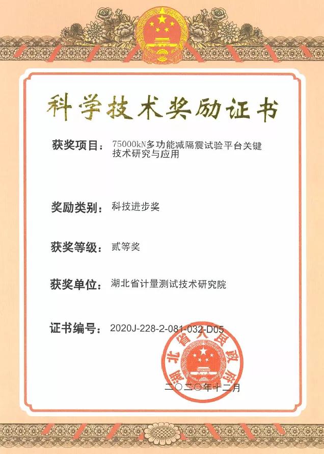 近日,湖北省計(jì)量院收到由湖北省人民政府頒發(fā)的獲獎(jiǎng)證書(shū),由其作為主要參與單位,與武漢海潤(rùn)工程設(shè)備有限公司、廣州大學(xué)、同濟(jì)大學(xué)、華中科技大學(xué)聯(lián)合申報(bào)的“75000kN多功能減震試驗(yàn)平臺(tái)關(guān)鍵技術(shù)研究與應(yīng)用”項(xiàng)目喜獲2020年度湖北省科技進(jìn)步二等獎(jiǎng)。