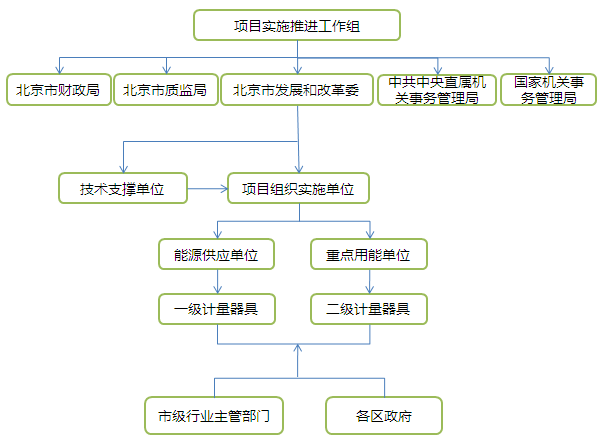 北京市的能源基礎(chǔ)能力建設(shè)工作涉及單位眾多,各層級單位分工明確,為項目順利奠定基礎(chǔ)。該項目由市發(fā)展改革委、市質(zhì)監(jiān)局、市財政局牽頭,中共中央直屬機關(guān)事務管理局、國家機關(guān)事務管理局公共機構(gòu)節(jié)能管理司共同推動,市級行業(yè)主管部門分類指導,各區(qū)政府分頭推進,項目組織實施單位負責組織落實,能源供應單位和重點用能單位具體實施。北京市電力公司、北京市燃氣集團有限責任公司、北京市自來水集團、北京市熱力集團有限責任公司等能源供應單位,負責實施重點用能單位相應能源品種的一級計量器具配置項目,各重點用能單位配合開展本單位電、氣、水、熱的一級計量器具配置,并負責實施本單位電、氣、熱、水的二級計量器具配置工作。能源計量建設(shè)組織架構(gòu)如圖4所示。