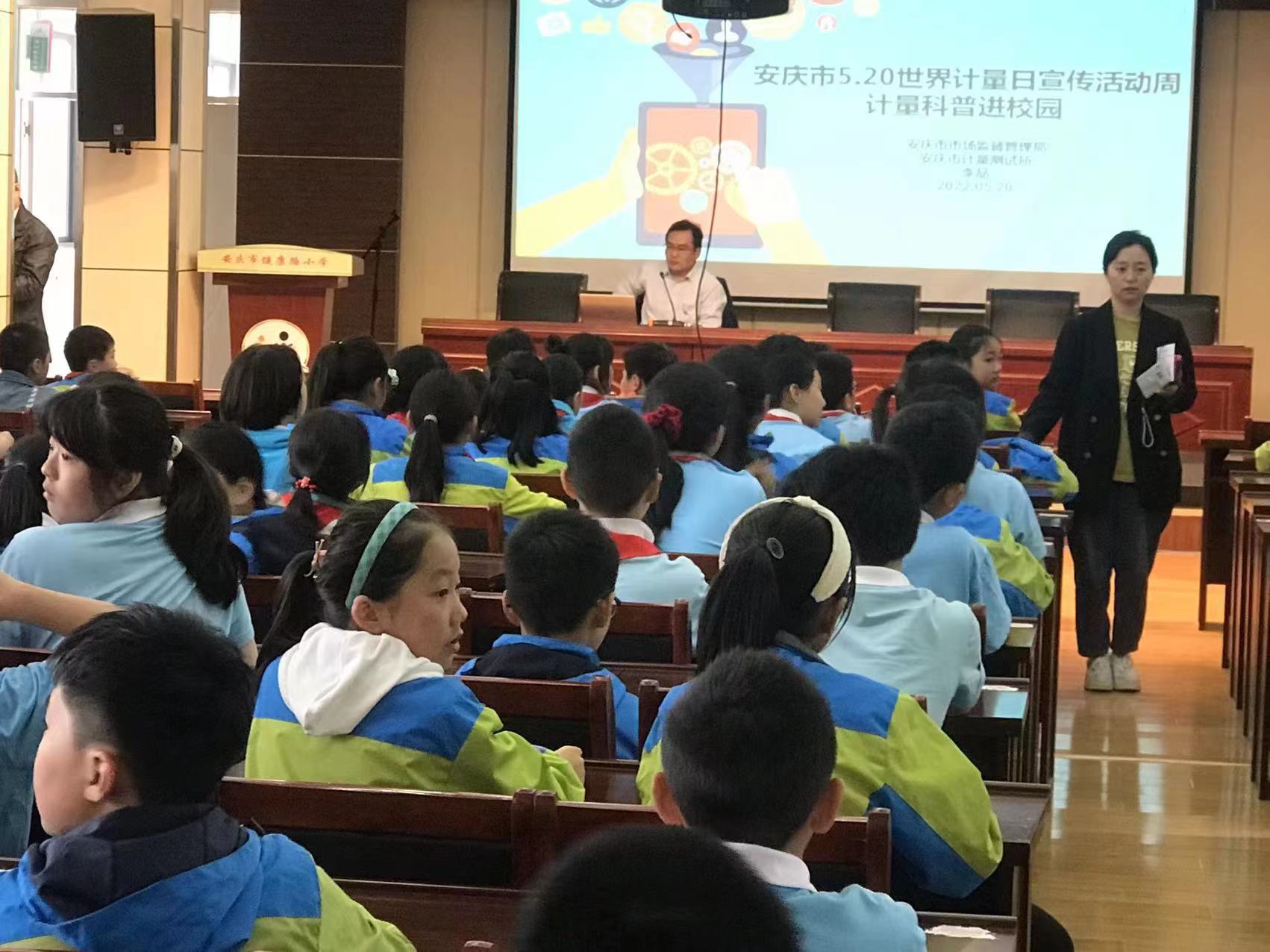 三是計量科普進校園。5月20日上午,計量科普小組來到安慶市健康路小學,為五年級兩個班的孩子們帶來了一場別開生面的計量專題講座。講座通過量與計量、生活中的計量、計量為我們的夢想插上翅膀3個板塊,以圖片、視頻的方式,深入淺出的講解了計量在生活中的重要性,向孩子們傳播和普及計量知識,在孩子們幼小的心靈中撒下計量的種子。