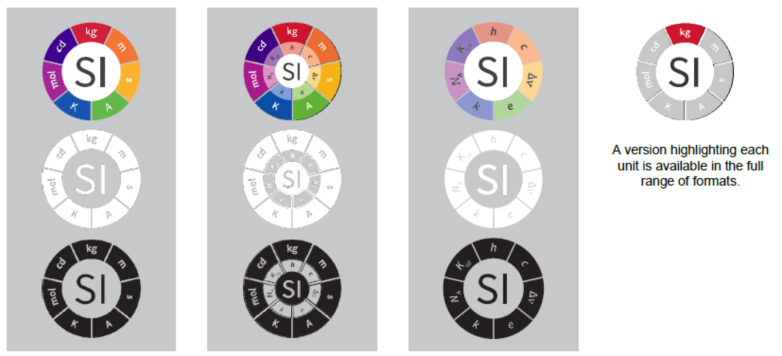 TGSI開發(fā)了如圖1所示3種不同格式的SI平面設(shè)計(jì),其中,7個(gè)SI基本單位分別以可見光譜中的7種不同顏色逐一呈現(xiàn)。所有格式和顏色的設(shè)計(jì)圖均可從www.bipm.org/en/si-download-area/下載。各國計(jì)量院和國際組織的宣傳材料都應(yīng)使用該設(shè)計(jì),這樣既突破了不同語言之間的交流障礙,也使得各國新SI推廣活動(dòng)共同構(gòu)成整個(gè)世界的新SI宣傳史。
