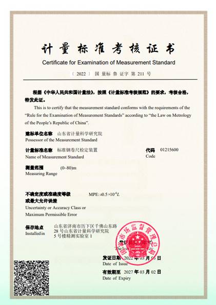 近日,山東省計(jì)量院申請(qǐng)建立的“標(biāo)準(zhǔn)鋼卷尺檢定裝置”順利通過國家市場監(jiān)督管理總局組織的建標(biāo)考核,并取得計(jì)量標(biāo)準(zhǔn)考核證書,現(xiàn)可面向全省開展標(biāo)準(zhǔn)鋼卷尺的檢校工作。