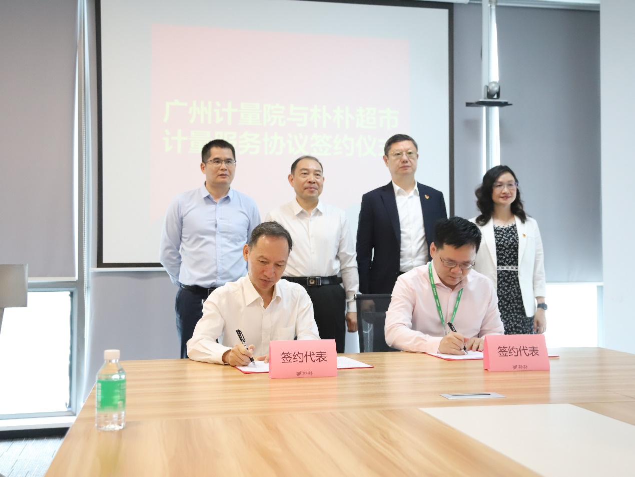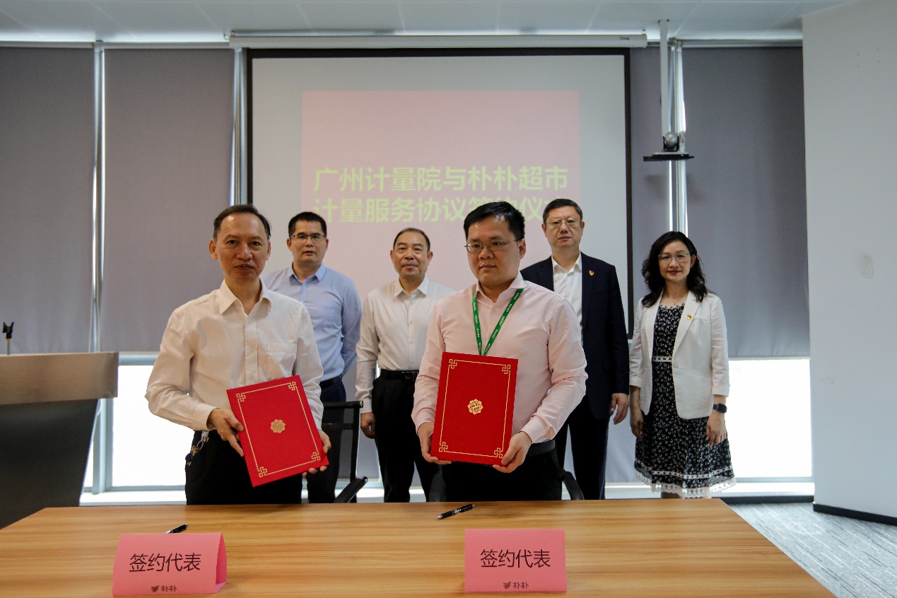 廣州計(jì)量院黃鋒副院長(zhǎng)與樸樸超市羅文總監(jiān)代表雙方單位現(xiàn)場(chǎng)簽約