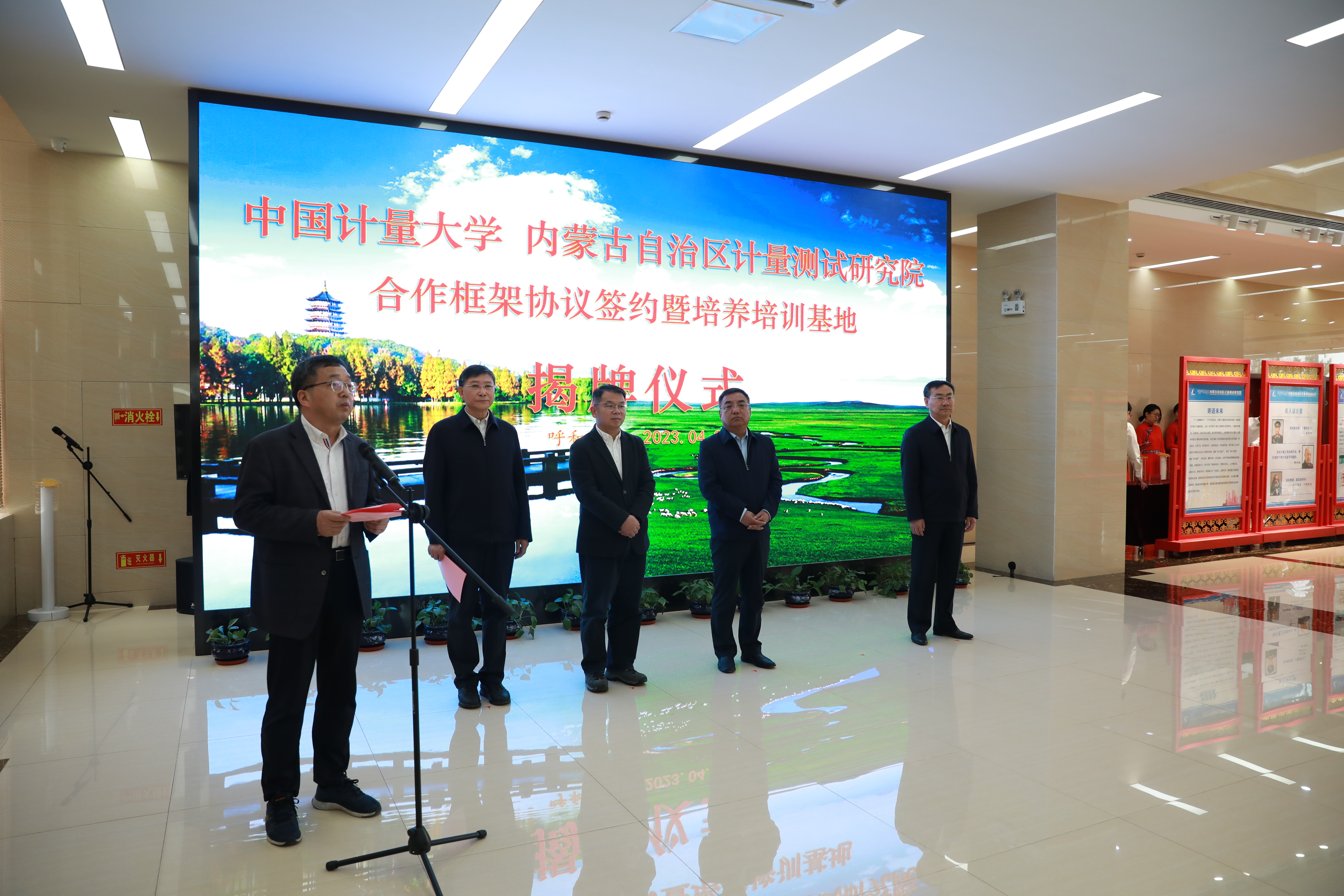 4月20日,中國(guó)計(jì)量大學(xué)與內(nèi)蒙古計(jì)量測(cè)試研究院深化合作框架協(xié)議簽約暨“研究生培養(yǎng)基地”和“計(jì)量測(cè)試技術(shù)人才培訓(xùn)基地”揭牌儀式在內(nèi)蒙古計(jì)量院舉行。內(nèi)蒙古市場(chǎng)監(jiān)督管理局黨組書記、局長(zhǎng)吳振清、中國(guó)計(jì)量大學(xué)副校長(zhǎng)俞曉平出席并致辭,內(nèi)蒙古市場(chǎng)監(jiān)督管理局一級(jí)巡視員呂金華主持儀式,內(nèi)蒙古計(jì)量院黨委書記、院長(zhǎng)孫磐與中國(guó)計(jì)量大學(xué)副校長(zhǎng)俞曉平簽署深化合作協(xié)議,中國(guó)計(jì)量大學(xué)、內(nèi)蒙古市場(chǎng)監(jiān)督管理局、計(jì)量院相關(guān)人員參加揭牌儀式。