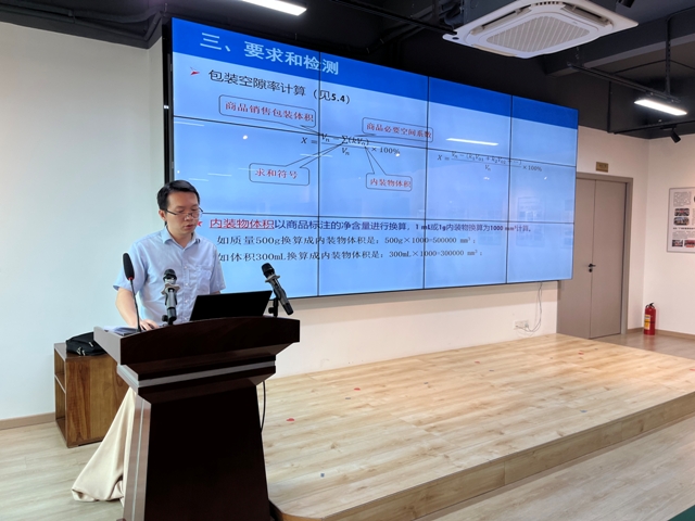 廣州計量院的高級工程師傅憶賓從“即將實施的新標準的主要內(nèi)容解讀”、“新標準典型疑問舉例”、“新標準與2009年版標準的內(nèi)容變化對比”等3個方面為參會人員進行了1個多小時的詳細講解,逐條解讀了新標準,結(jié)合商品實物圖和計算實例進行檢驗結(jié)果分析;明確了內(nèi)裝物、單件、包裝空隙率指標要求、商品必要空間系數(shù)、計算方法等方面的注意事項。