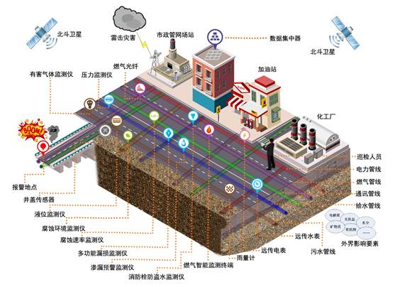 203所智慧市政團(tuán)隊(duì)走訪了幾十個(gè)城市,上百家管線管理單位,通過交流對(duì)接,分析總結(jié)地下管線管理存在的難點(diǎn)問題。針對(duì)地下相鄰空間類型多,風(fēng)險(xiǎn)排查難,燃?xì)庑孤┘墼诘叵旅荛]空間,易引發(fā)大規(guī)模爆炸事故,導(dǎo)致人員傷亡;市政井蓋破損、被盜形成“馬路黑洞,吃人陷阱”;熱力管線泄漏易造成馬路塌陷,經(jīng)常造成人員傷亡和車輛事故;城鎮(zhèn)老舊管網(wǎng)的數(shù)據(jù)丟失,更新不及時(shí),巡檢易受限,泄漏難察覺等痛點(diǎn)問題,203所量身定制解決方案,對(duì)癥下藥。