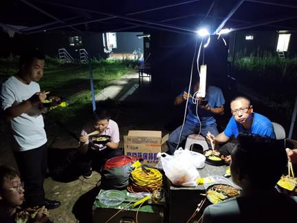 像這樣的出差試驗,就意味著沒有周末,沒有固定的上下班時間、吃飯時間,風(fēng)餐露宿、披星戴月成了他們的工作日常。已經(jīng)夜里十一點多了,微弱的燈光下,設(shè)計師們蹲坐在涼棚里吃著盒飯,由于白天試驗內(nèi)容繁重,常常顧不上吃飯,這樣的場景幾乎每天都在上演。