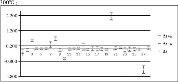 從圖4、圖5中可看出,300℃點的比對結果很不滿意,合格率非常低。造成300℃檢定點測量結果不滿意的主要原因有以下三點: