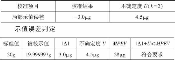 這是一臺百萬分之一克的質(zhì)量比較儀,作為F1等級克組砝碼的量值傳遞用。JG99-2006《砝碼檢定規(guī)程》之7.2.2要求,如果被檢砝碼不進行空氣浮力修正,則合成標(biāo)準(zhǔn)不確定度不得超過被檢砝碼最大允許誤差絕對值的九分之一,20gF1等級的砝碼最大允差為0.25mg,九分之一為28μg,3.0μg+4.5μg﹤28μg,該質(zhì)量比較儀在20g這個點符合使用要求。