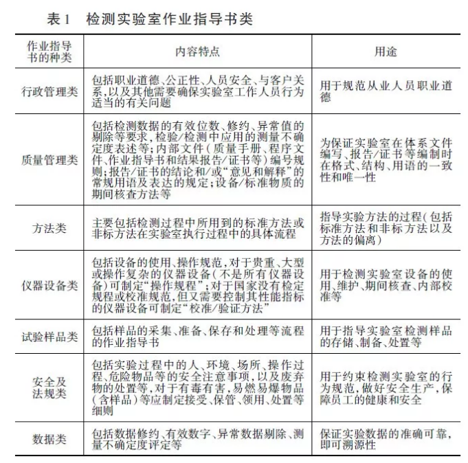 作業(yè)指導(dǎo)書是“有關(guān)任務(wù)如何實(shí)施和記錄的詳細(xì)描述”,是用來指導(dǎo)檢測實(shí)驗(yàn)室具體運(yùn)轉(zhuǎn)過程,形成的具體的技術(shù)性強(qiáng)且可操作的文件形式,檢測實(shí)驗(yàn)室的作業(yè)指導(dǎo)書一般應(yīng)具有合理性、記錄詳細(xì)、簡單明了、可操作性強(qiáng)等特點(diǎn),同時作業(yè)指導(dǎo)書也需要在影響檢測過程的每一個環(huán)節(jié)制定。結(jié)合以上特性,檢測實(shí)驗(yàn)室所編寫的作業(yè)指導(dǎo)書應(yīng)當(dāng)包括以下幾種(見表1)。