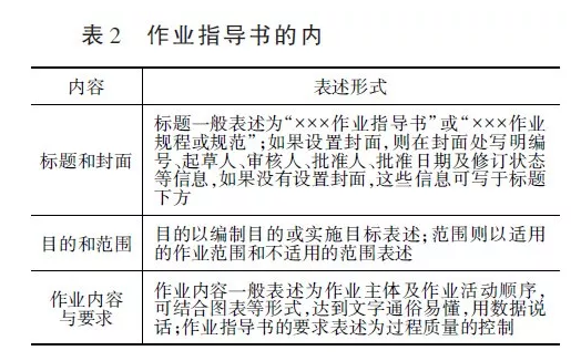 作業(yè)指導(dǎo)書一般不采用統(tǒng)一的格式和結(jié)構(gòu),但在同一種組織體系內(nèi)為保持一致性,通常采用同樣的格式和結(jié)構(gòu)。但無論何種格式或組合,作業(yè)指導(dǎo)書編寫內(nèi)容與作業(yè)活動的順序相一致,必須如實(shí)準(zhǔn)確地反映作業(yè)要求及相關(guān)內(nèi)容。同時內(nèi)容應(yīng)適合檢測或單位其他人員使用,并符合作業(yè)指導(dǎo)書所表述的生產(chǎn)或管理活動的復(fù)雜程度以及使用人員的技術(shù)水平及技能資質(zhì)和資格等。作業(yè)指導(dǎo)書的內(nèi)容一般包括以下幾部分(見表2)。