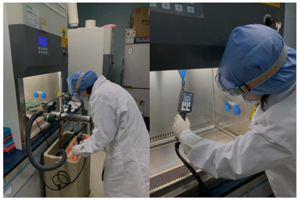 鑒于武漢某新型冠狀病毒肺炎定點(diǎn)醫(yī)院檢驗(yàn)科的檢驗(yàn)師們只做化驗(yàn)和測(cè)試卻有4位受感染的前車之鑒,廣醫(yī)二院高度重視所用Ⅱ級(jí)生物安全柜的安全性和可靠性,向廣州計(jì)量院提出加急檢測(cè)需求。廣州計(jì)量院堅(jiān)決貫徹習(xí)近平總書記“堅(jiān)持把人民群眾生命安全和身體健康放在第一位”的重要指示,不畏危險(xiǎn),迎難而上,緊急調(diào)派精干技術(shù)力量迅速響應(yīng)檢測(cè)需求,奔赴現(xiàn)場(chǎng)對(duì)生物安全柜進(jìn)行全面檢測(cè),有效防止高效過濾器完整性、人員保護(hù)、產(chǎn)品保護(hù)、交叉污染保護(hù)等核心指標(biāo)不符合要求的設(shè)備投入使用,為保障新型冠狀病毒化驗(yàn)測(cè)試結(jié)果可靠、防止病毒等污染材料外泄、保護(hù)檢驗(yàn)檢疫人員健康提供有力的計(jì)量技術(shù)支撐。