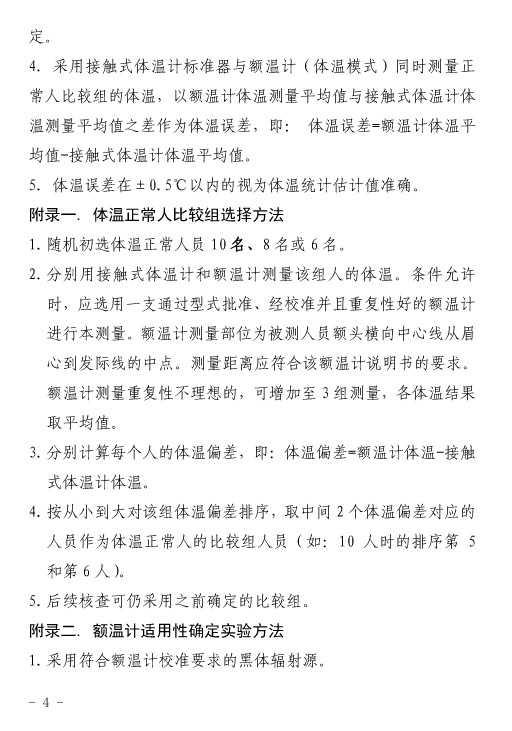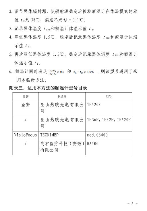 同時(shí)建議省級(jí)及以上計(jì)量院開展確定本方法對(duì)紅外額溫計(jì)適用性實(shí)驗(yàn)工作,形成適用于本方法的紅外額溫計(jì)適用型號(hào)目錄。適用型號(hào)由省級(jí)及以上計(jì)量院發(fā)布。