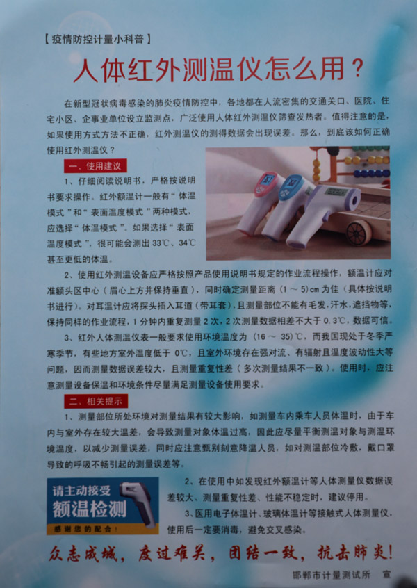技術(shù)培訓(xùn),科普計量。在積極開展計量技術(shù)服務(wù)的同時,主動響應(yīng),利用電子大屏幕、微信群、辦公網(wǎng)絡(luò)等渠道科普計量知識,講解如何識別和購買紅外額溫計,正確使用測溫儀器,并制件了《人體紅外測溫儀怎么用》宣傳單頁,免費向社會發(fā)放。另外,采取企業(yè)送檢器具時免費贈送標(biāo)準(zhǔn)玻璃體溫計的方式,確保企業(yè)復(fù)產(chǎn)復(fù)工體溫有標(biāo)準(zhǔn)計量器。