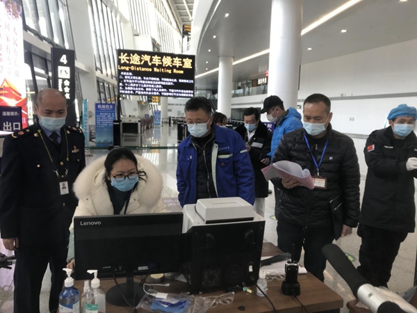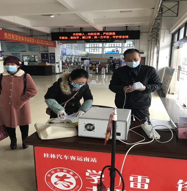 (桂林市市場(chǎng)監(jiān)管局工作人員在汽車站開展檢測(cè)排查工作)