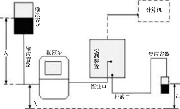圖1中,h1為輸液容器到輸液泵的高度;h2為輸液泵的輸入端、測量系統(tǒng)輸出端到同一水平面的高度,二者高度應相同。校準方法:按圖1方式連接好校準裝置,向管路中灌注液體,保證管路中無空氣。根據(jù)被校儀器的使用范圍,選擇合適的校準點,從檢測儀及被檢輸液泵讀數(shù)流量值,并計算流量誤差值、流量重復性值。需要注意的是,對于同時期瞬時流量和平均流量測量功能的檢測儀,應記錄平均流量讀數(shù)。