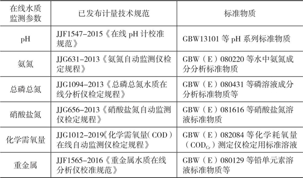 標(biāo)準(zhǔn)物質(zhì)是技術(shù)規(guī)范順利有效實(shí)施的重要支撐,針對(duì)環(huán)境監(jiān)測(cè)領(lǐng)域關(guān)注的水質(zhì)技術(shù)參數(shù),以中國(guó)計(jì)量科學(xué)研究院為代表的標(biāo)準(zhǔn)物質(zhì)研制單位,可以提供包括pH、電導(dǎo)、濁度、TOC、總磷、總氮、化學(xué)需氧量等多類(lèi)國(guó)家級(jí)標(biāo)準(zhǔn)物質(zhì),不僅能夠滿足現(xiàn)有計(jì)量技術(shù)規(guī)范的要求,還可以支撐環(huán)境監(jiān)測(cè)部門(mén)自身行業(yè)標(biāo)準(zhǔn)的實(shí)施。表1列出了我國(guó)目前在線水質(zhì)監(jiān)測(cè)參數(shù)及與其對(duì)應(yīng)的現(xiàn)有計(jì)量校準(zhǔn)規(guī)范和標(biāo)準(zhǔn)物質(zhì)。