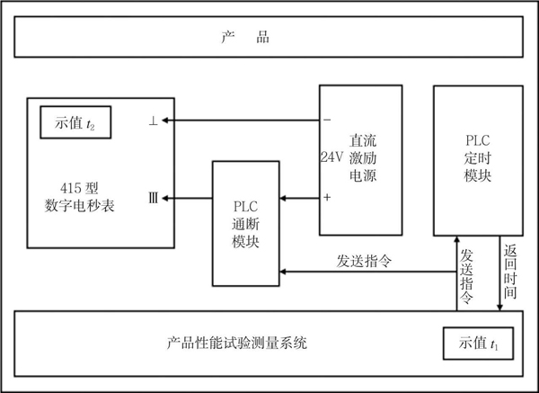 選用成都鐘表廠生產(chǎn)的415型數(shù)字電秒表,最大允許誤差為±(5×10-5Rd+時(shí)基),時(shí)基選擇0.001s,模式置“連續(xù)”;以及相應(yīng)的1214C型PLC通斷模塊,測(cè)量分辨力為0.001s,通斷模塊初始狀態(tài)設(shè)為斷開,串入激勵(lì)電源正電壓通路,校準(zhǔn)方法示意圖如圖2所示。