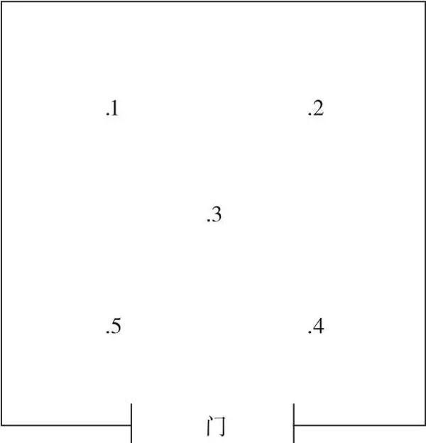 一般真空箱的工作空間體積小于0.4m3,因此,選取工作空間的中層作為測試平面。中層為通過工作室?guī)缀沃行牡钠叫杏诘酌娴男?zhǔn)工作面,測試點(diǎn)與工作室內(nèi)壁的距離不小于各邊長的1/10,測試點(diǎn)的位置布局及數(shù)量,如圖1所示。工作空間體積大于0.4m3的真空箱,測試點(diǎn)的數(shù)量可以適當(dāng)增加至9個或更多,其測試點(diǎn)的位置布置可以參考JJF1101-2003《環(huán)境試驗(yàn)設(shè)備溫度、濕度校準(zhǔn)規(guī)范》中的測試點(diǎn)位置布置圖。