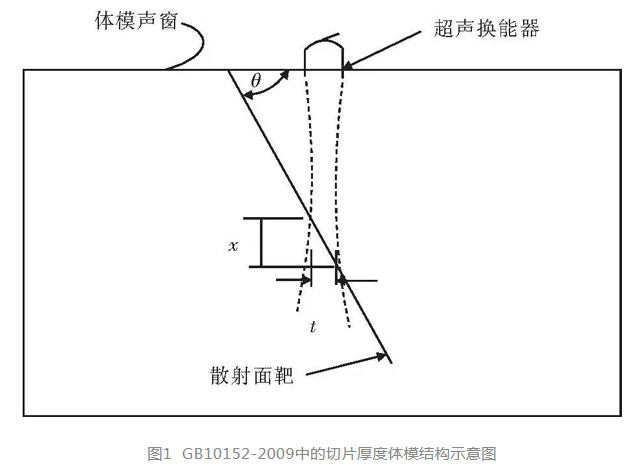 眾所周知,檢測(cè)二維灰階圖像的軸向、側(cè)向分辨力的標(biāo)準(zhǔn)化方法是借助于超聲體模中相應(yīng)的線靶。但這種方法并不適用于切片厚度檢測(cè)。在IEC61390∶1996《超聲實(shí)時(shí)脈沖回波系統(tǒng)性能試驗(yàn)方法》和國(guó)家標(biāo)準(zhǔn)GB10152-2009中,對(duì)切片厚度指標(biāo)的規(guī)定檢測(cè)設(shè)備是切片厚度專用體模,其基本結(jié)構(gòu)如圖1所示,即在超聲體模的殼體中,斜向安置一塊與聲窗成指定角度α、表面布滿散射體的平板,且散射回波強(qiáng)度明顯高于背景仿組織材料。切片厚度體模與低頻、高頻體模的另一個(gè)明顯差別是,為確保整個(gè)探頭下方均為仿組織材料,其側(cè)壁短邊的內(nèi)尺寸不是50mm,而是100mm。GB10152-2009中規(guī)定,切片厚度體模所用超聲仿組織材料的聲學(xué)特性與低頻(多用型)和高頻(小器官型)體模相同,即聲速為(1540±10)m/s,聲衰減系數(shù)斜率為(0.7±0.05)dB/(cm·MHz);并要求散射面靶層厚度小于0.4mm。