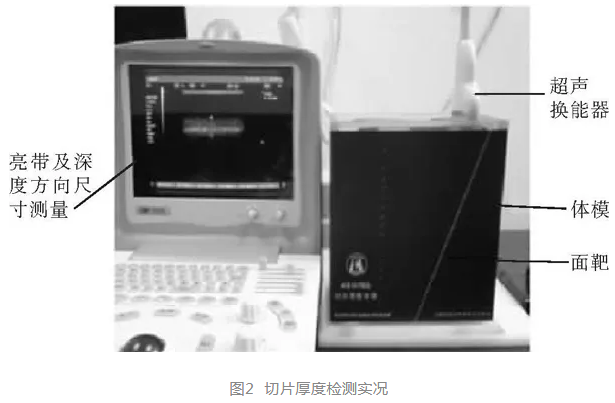 圖2是利用國(guó)產(chǎn)切片厚度體模檢測(cè)高頻線陣探頭切片厚度的照片。體模面板上的白色斜線所示,即散射面靶所在位置及傾斜角度。檢測(cè)的基本步驟如下: