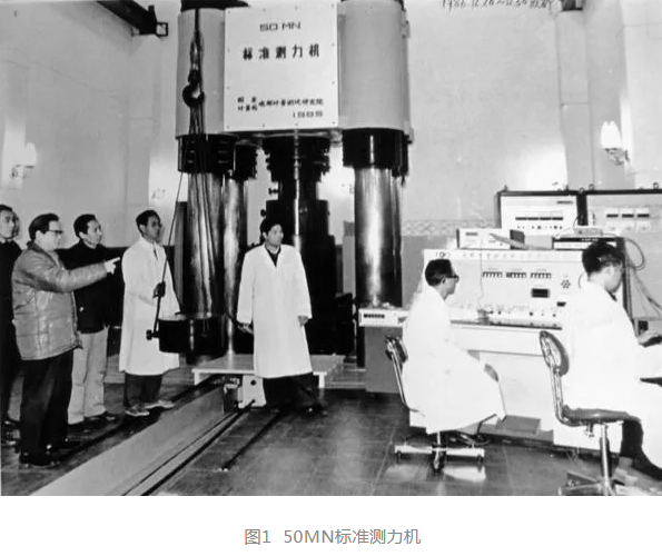 1978年起,我開始承擔(dān)“20MN(2000噸力)液壓式基準(zhǔn)測(cè)力機(jī)”課題組長(zhǎng),到1981年才落實(shí)承制廠。1977年起,計(jì)量分院著手研制力源式50MN(5000噸力)標(biāo)準(zhǔn)測(cè)力機(jī)。同年5月,我與計(jì)量分院何文炫在上海調(diào)查大力源,即2000~5000噸力油壓機(jī)。因?yàn)?0MN標(biāo)準(zhǔn)測(cè)力機(jī)的基礎(chǔ)就是5000噸力油壓機(jī)。1979年4月,我在成都參加了計(jì)量分院召開的第一次“5000噸力力源方案”討論會(huì)。1981年6月我參加了計(jì)量分院在桂林召開的第二次“5000噸力力源方案討論會(huì)”,大家一致認(rèn)為2000噸力以上采用力源式來建立標(biāo)準(zhǔn)測(cè)力機(jī)是正確的選擇。1986年下半年,5000噸力標(biāo)準(zhǔn)測(cè)力機(jī)研制成功,同年12月下旬,我主持了“50MN標(biāo)準(zhǔn)測(cè)力機(jī)鑒定會(huì)”,這臺(tái)測(cè)力機(jī)安裝在計(jì)量分院大邑基地(見圖1)。