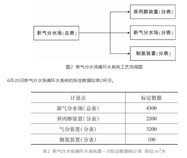從表1中數(shù)據(jù)可以看出,3次標(biāo)定的結(jié)果出現(xiàn)了很大的誤差,使得標(biāo)定出的數(shù)據(jù)無法采用。再舉第二個(gè)例子,請(qǐng)看新氣分水場(chǎng)循環(huán)水系統(tǒng)工藝流程圖(見圖2)。