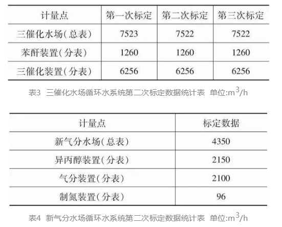 從以上的數(shù)據(jù)和實(shí)例可以看出,雖然這只是個(gè)別現(xiàn)象,但如果出現(xiàn)在關(guān)鍵數(shù)據(jù)上,會(huì)給生產(chǎn)帶來極大的隱患,甚至?xí)霈F(xiàn)安全事故,節(jié)能減排降耗更無從談起。還是以上述新氣分水場(chǎng)循環(huán)水系統(tǒng)為例,在發(fā)現(xiàn)標(biāo)定數(shù)據(jù)有誤后,通過查找原因,我們認(rèn)為是管道襯里和管壁結(jié)垢造成的輸入管徑數(shù)據(jù)有誤,導(dǎo)致檢測(cè)數(shù)據(jù)失準(zhǔn)(這在后期的檢修并對(duì)管線內(nèi)部查看時(shí),證實(shí)了這一點(diǎn))。這樣我們及時(shí)地調(diào)整了標(biāo)定的位置,并配以超聲波測(cè)厚儀,在管線上尋找最佳標(biāo)定位置。下面是調(diào)整了標(biāo)定位置后標(biāo)定的數(shù)據(jù)(見表3和表4)。