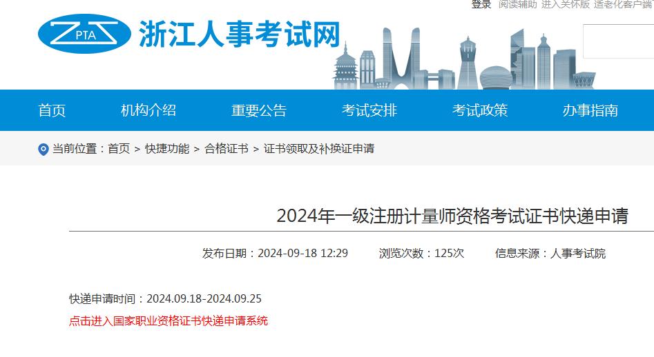 浙江2024年度一二級注冊計量師資格考試證書快遞申請