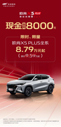 歐尚X5 PLUS全系限時送出8000元現(xiàn)金直降,同時最高可享0首付或0月供或0利息的金融支持,讓購車0壓力。