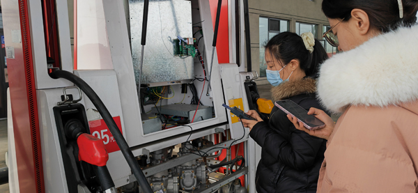 在檢定現(xiàn)場(chǎng),檢定人員嚴(yán)格按照JJG443-2015《燃油加油機(jī)檢定規(guī)程》進(jìn)行檢定,一是檢查加油機(jī)計(jì)控主板、編碼器、流量測(cè)量變換器的鉛封是否完好,排除擅自改動(dòng)加油機(jī)情況;二是檢查加油機(jī)內(nèi)部芯片主板,使用專用POS機(jī)查詢防作弊軟件運(yùn)行是否正常,排除加油機(jī)內(nèi)部芯片主板偷換或改裝情況;三是對(duì)燃油加油機(jī)的示值誤差和重復(fù)性進(jìn)行強(qiáng)制檢定,對(duì)于存在誤差的現(xiàn)場(chǎng)進(jìn)行調(diào)試,確保每把加油槍量值準(zhǔn)確可靠;四是對(duì)檢定合格的加油機(jī)張貼強(qiáng)制檢定合格標(biāo)志,出具檢定證書。確保檢定過程科學(xué)規(guī)范、檢定記錄追溯可查、檢定結(jié)果準(zhǔn)確可靠。五是向加油站負(fù)責(zé)人宣傳國(guó)家市場(chǎng)監(jiān)督管理總局頒發(fā)的《加油站計(jì)量監(jiān)督管理辦法》,并對(duì)加油站計(jì)量管理人員進(jìn)行技術(shù)指導(dǎo),引導(dǎo)其科學(xué)管理、規(guī)范操作、依法開展加油機(jī)日常維護(hù)工作。目前已對(duì)轄區(qū)12家加油站84槍燃油加油機(jī)完成強(qiáng)制周期檢定工作。