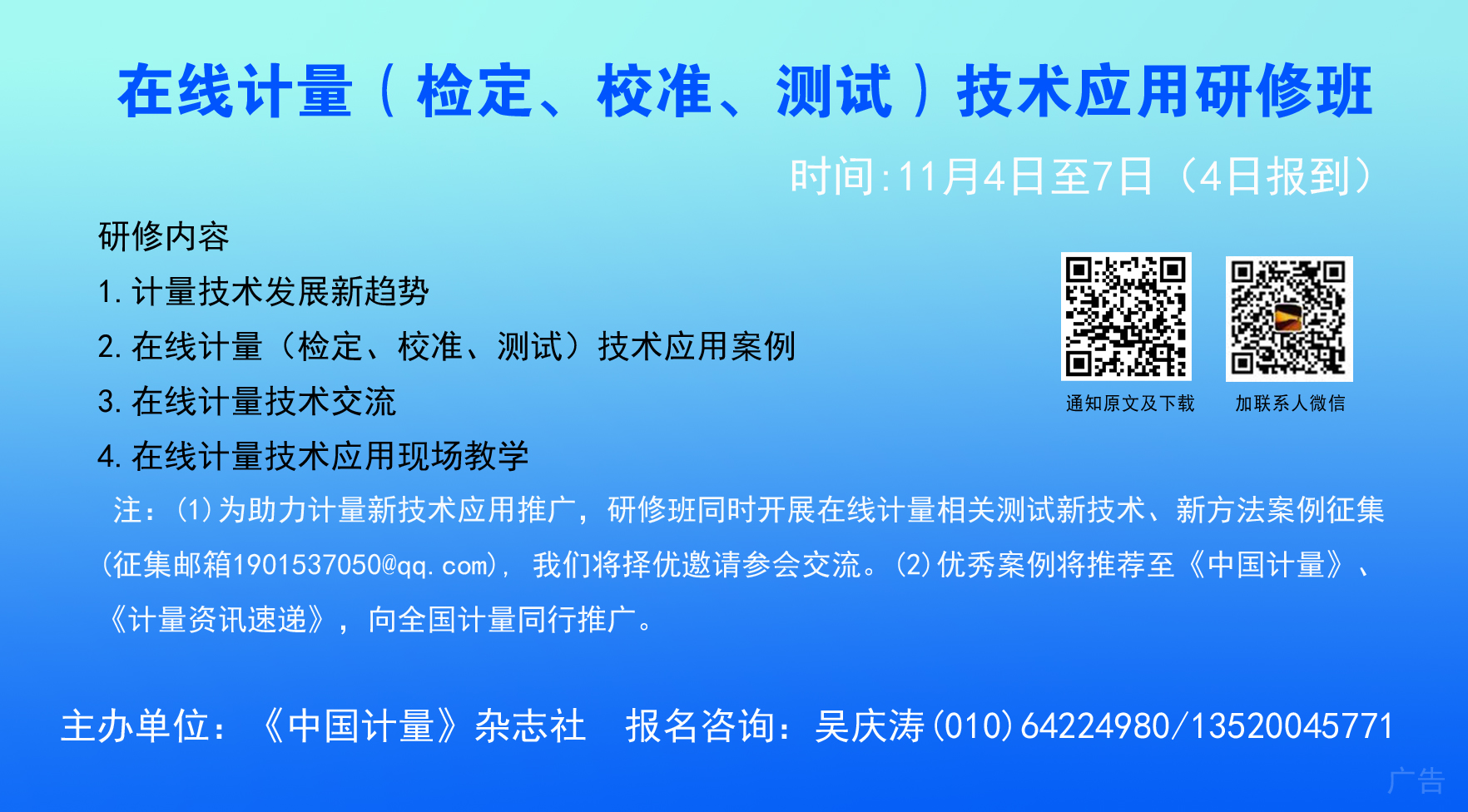 1.報名聯(lián)系人:吳慶濤(010)64224980/13520045771(微信),郵箱zgjlbk@qq.com。