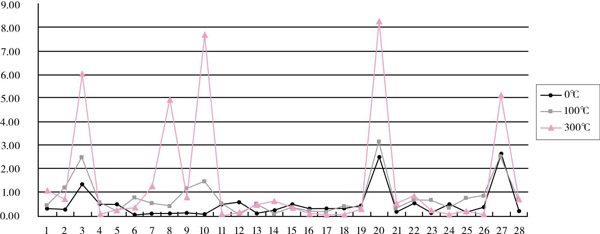 以En值為縱坐標,得出28個實驗室在0℃、100℃、300℃時的En值分布圖(見圖4)。