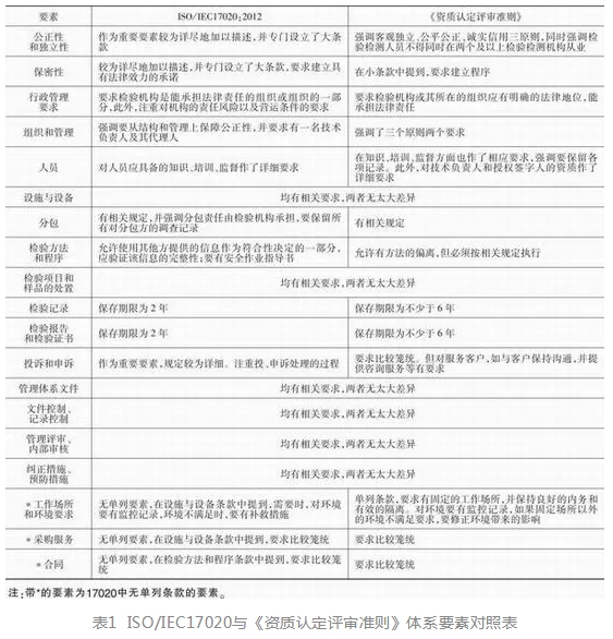 1.ISO/IEC17020與《檢驗檢測機構資質認定評審準則》各要素的比較