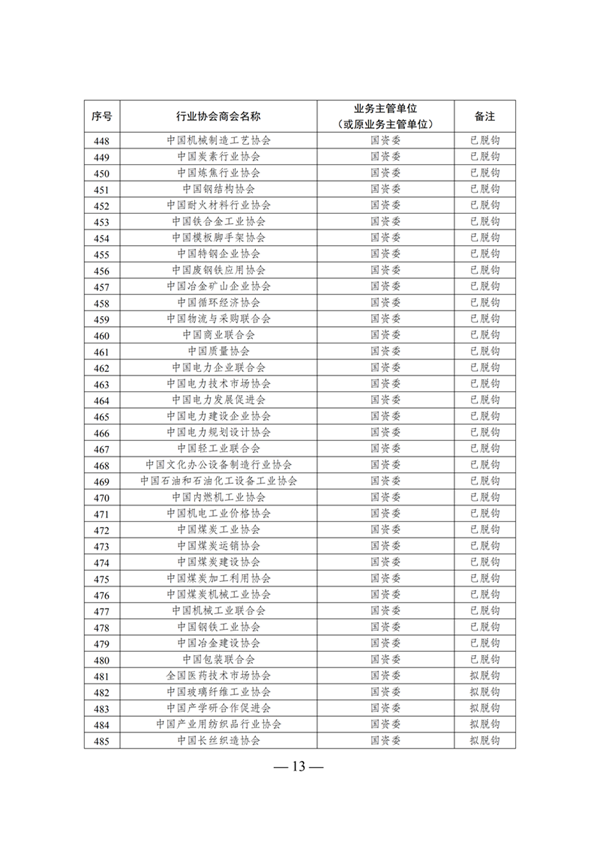 列入脫鉤名單的全國(guó)性行業(yè)協(xié)會(huì)商會(huì)(見附件),必須按規(guī)定要求和時(shí)限完成脫鉤。暫未列入脫鉤名單的全國(guó)性行業(yè)協(xié)會(huì)商會(huì),暫時(shí)實(shí)行業(yè)務(wù)主管單位和登記管理機(jī)關(guān)雙重管理,同時(shí)按照去行政化的要求,加快推進(jìn)相關(guān)改革。
